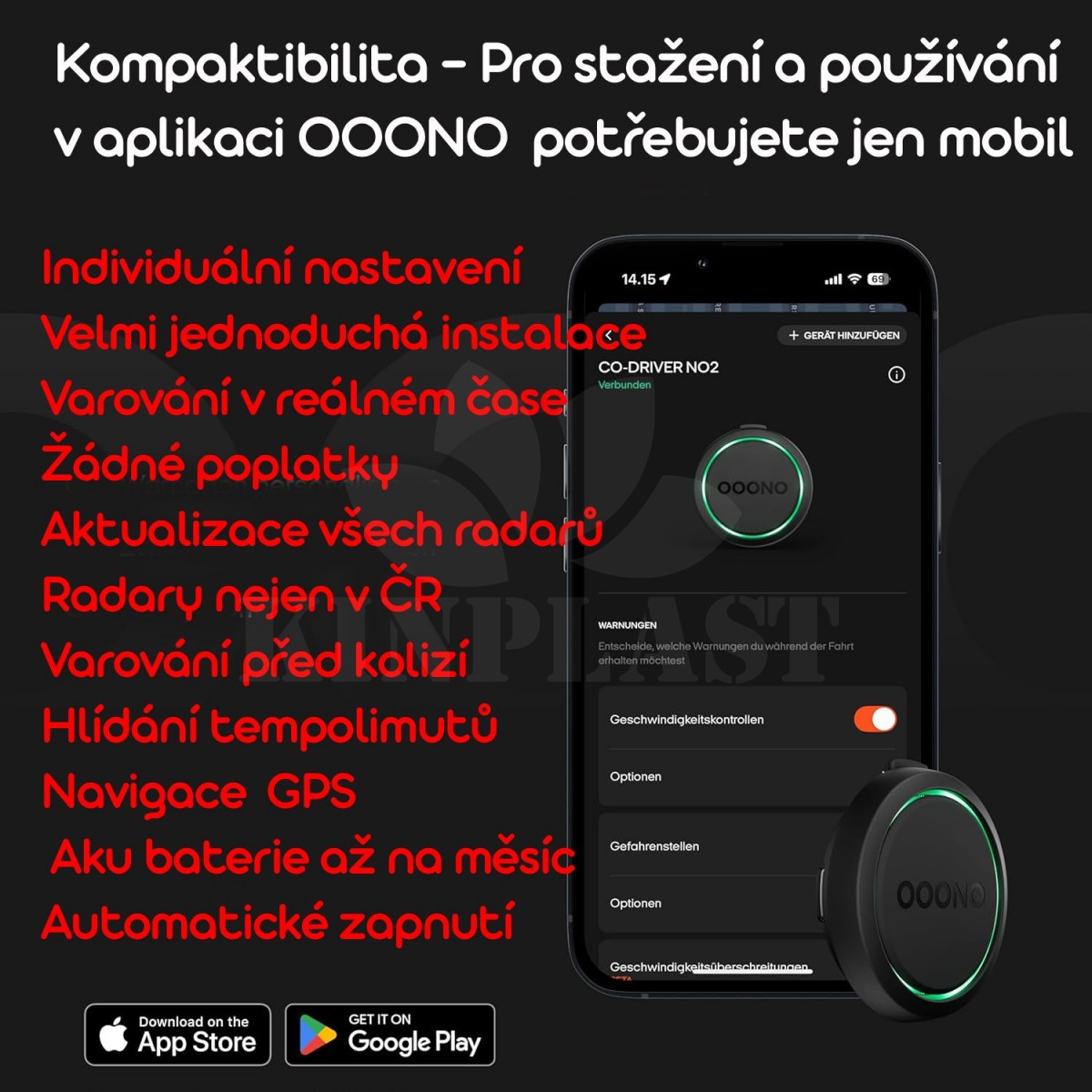 - Bezpečnostní pokyny: OOONO CO-DRIVER má zvýšit vaši bezpečnost v silničním provozu. Dávejte pozor na platná dopravní pravidla a předpisy StVO. Použití varování před nebezpečím probíhá na vlastní odpovědnost.