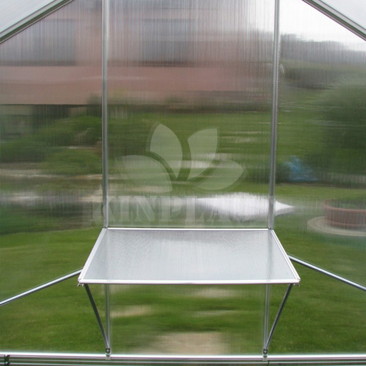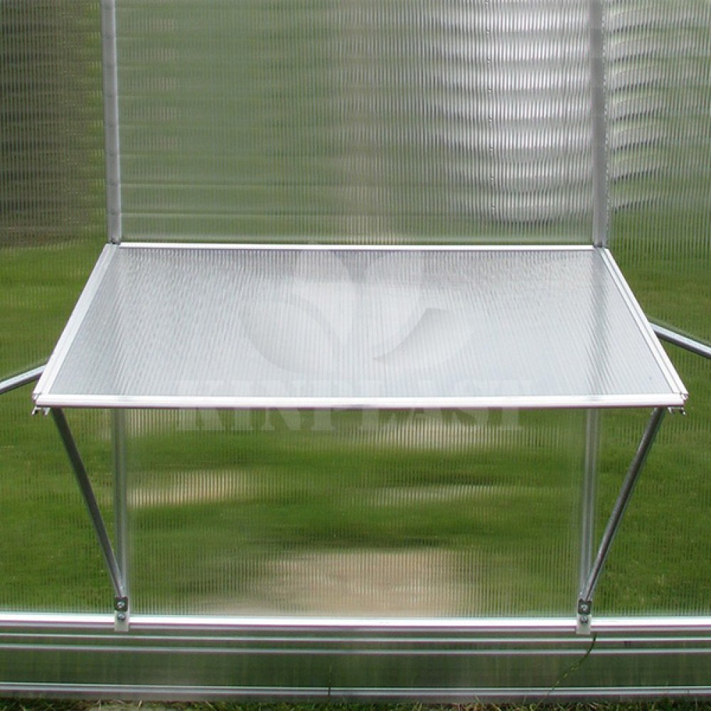 Závěsný stůl do zahradního skleníku Gampre SANUS a Gardentec má rám z hliníkového profilu a desky z polykarbonátu 6mm, přičemž přední hrana je opatřena hliníhovým zakončovacím profilem.