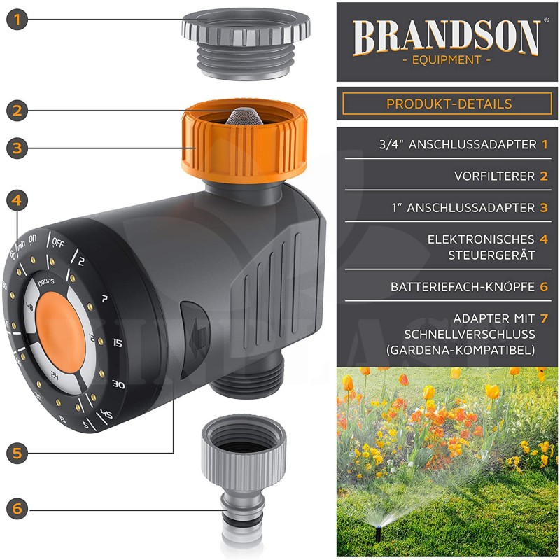 Ovládání zavlažování od Brandson vám ušetří čas a práci na zahradě. Připojte přístroj mezi vodovodní kohoutem a zahradní hadicí, aby se regulovalo doby zavlažování a cykly. Zavlažování se provádí automaticky, takže vaše zahrada bude konstantně zásobována vodou. Systém je ekologický a snadno ovladatelný.